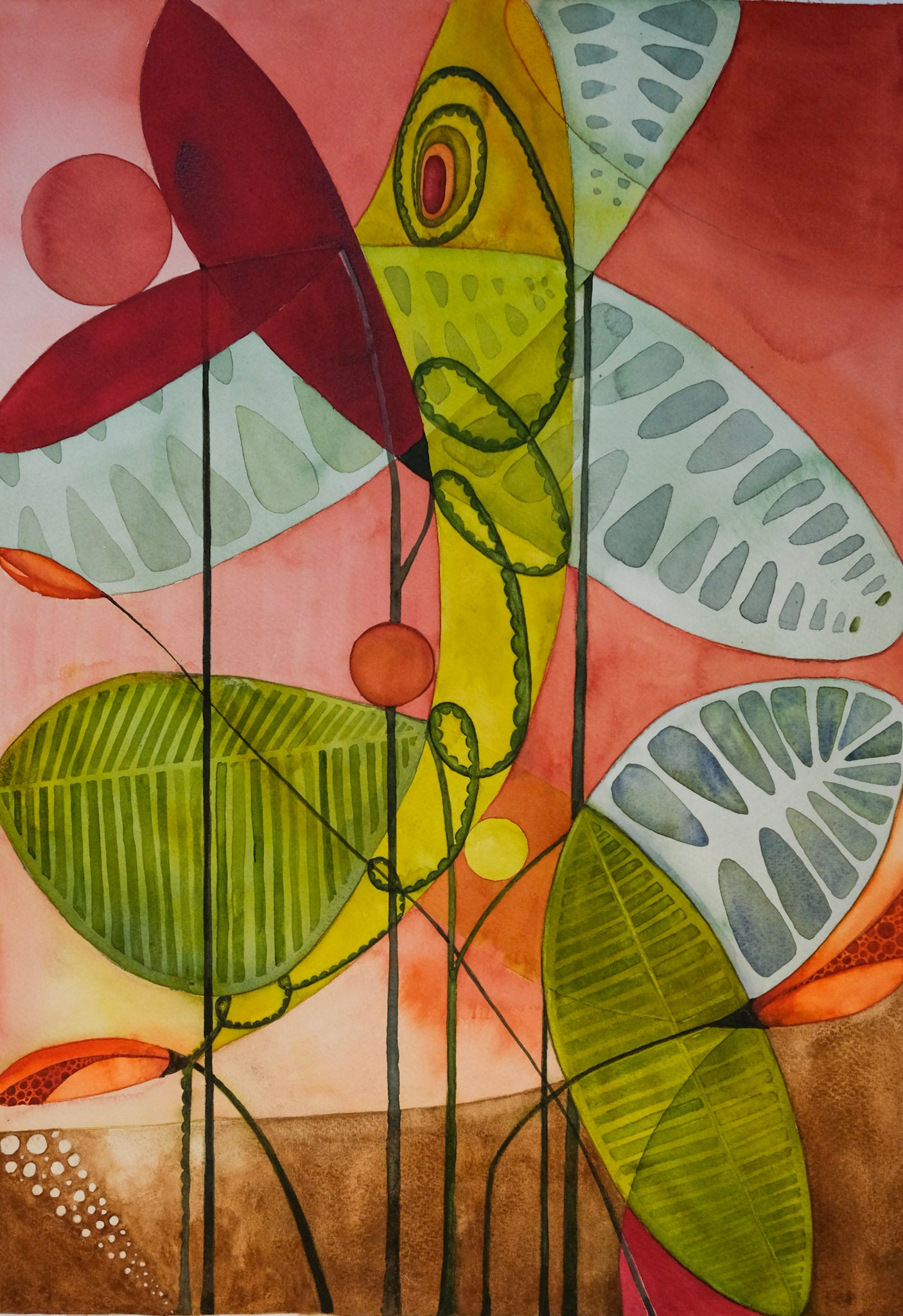 Den här akvarellmålningen kom till mig efter en period utan målning, utan varken inspiration eller tid. Så en dag plockade jag upp färgerna och målade de färger och former som fanns inuti mig utan krav på att det skulle bli något. Det är tunna lager på lager av akvarellfärg som sakta fått växa fram.