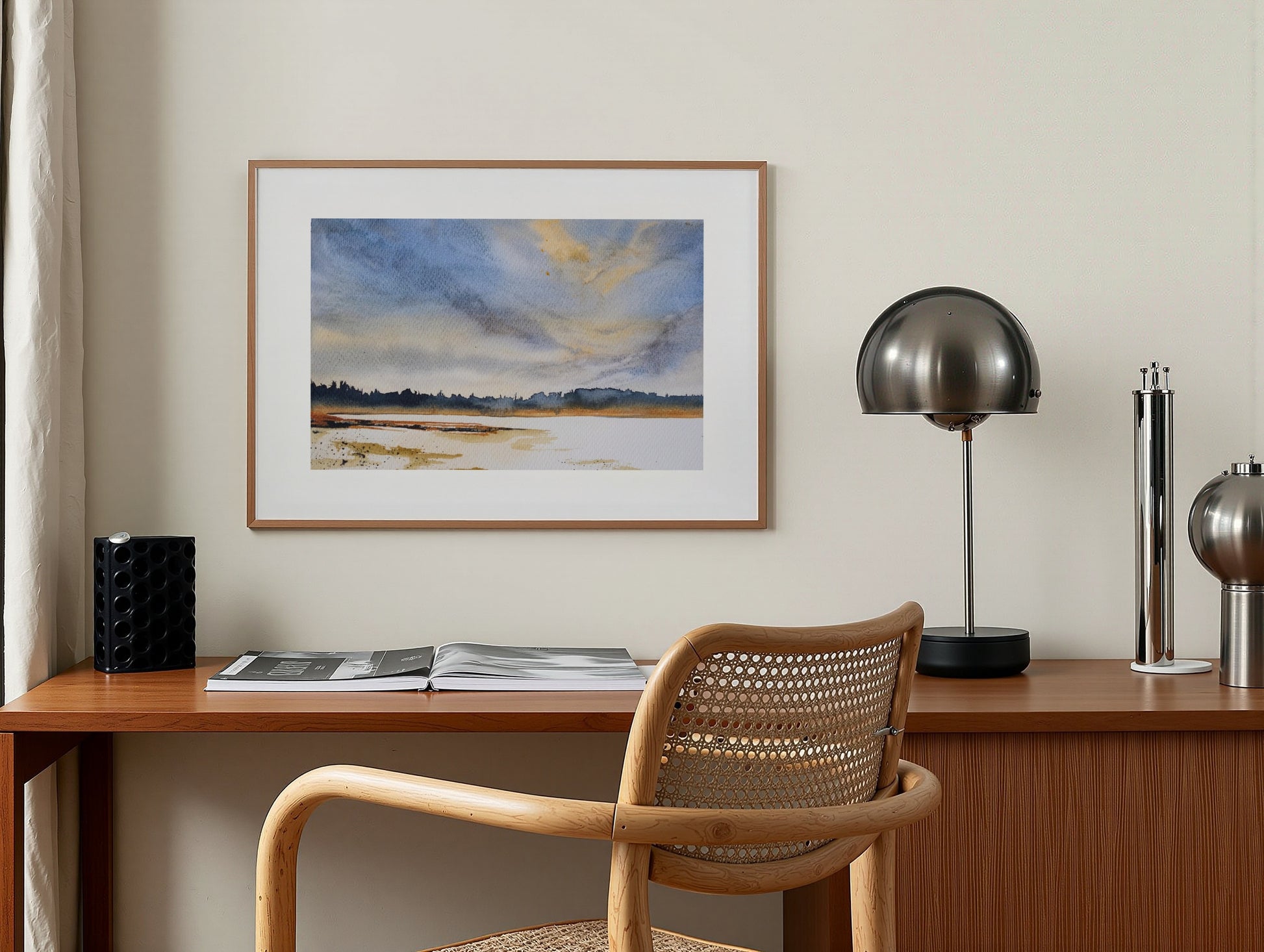 Originalmålningen mäter 20 × 30 cm och levereras som standard i en syrafri passepartout med yttermått 30 × 40 cm. Väljer du till ram levereras verket färdiginramat med Artglass, ett reflexfritt och UV-skyddande glas som hjälper till att bevara färgerna över tid.