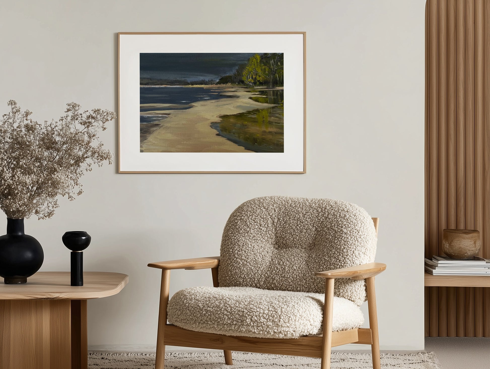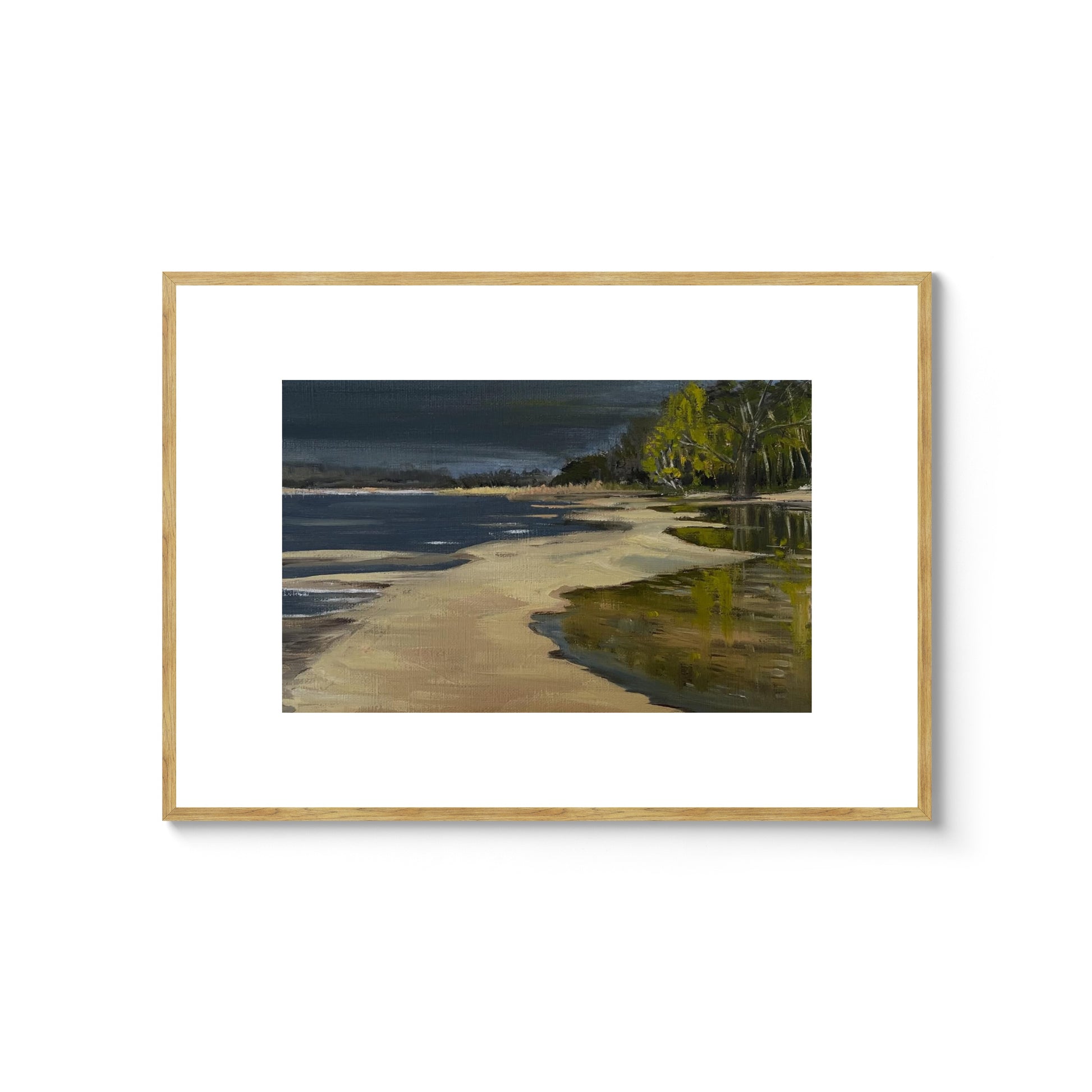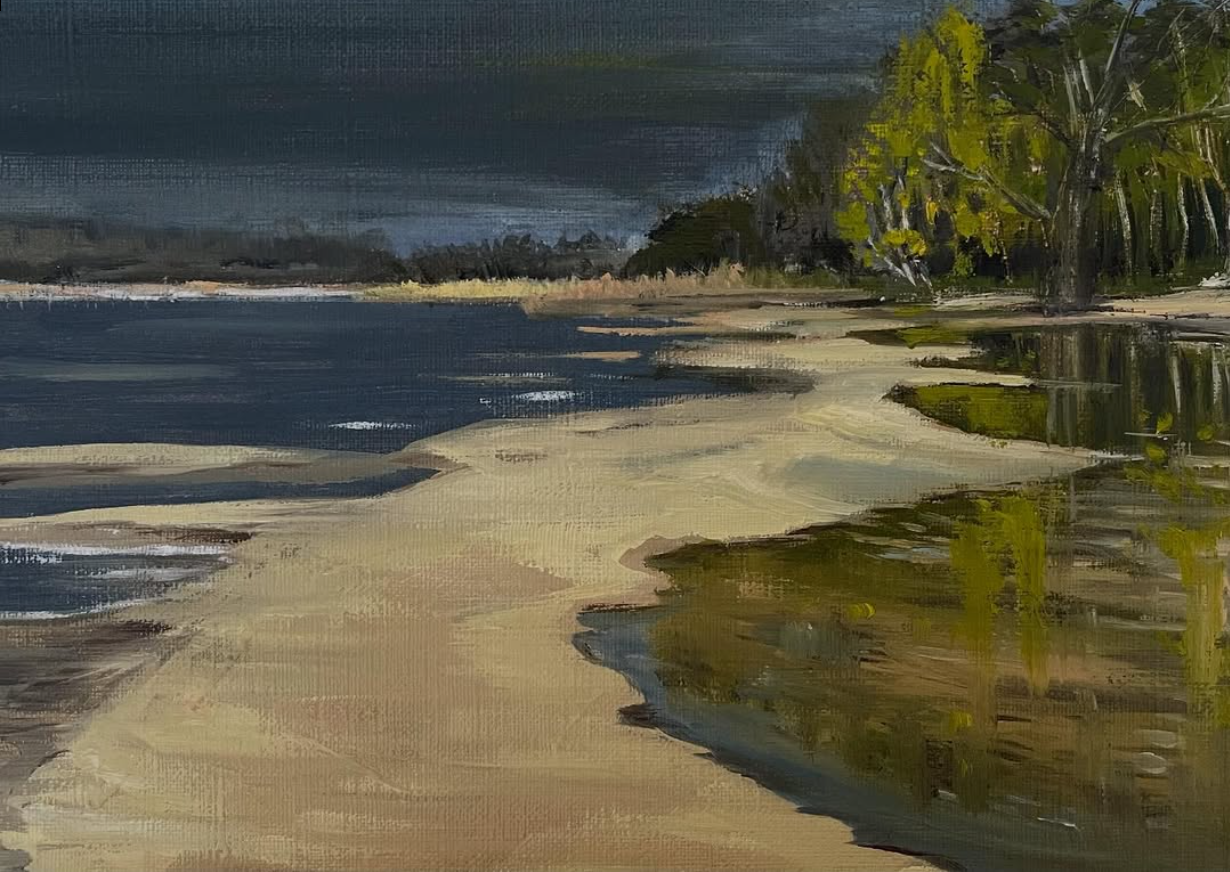 Den här oljemålningen målade jag efter en blåsig sensommarpromenad på stranden i Sätila. Vädret höll på att skifta från soligt till storm och regn. Vattenståndet var lågt och sanden låg blottad i vackra mönster.